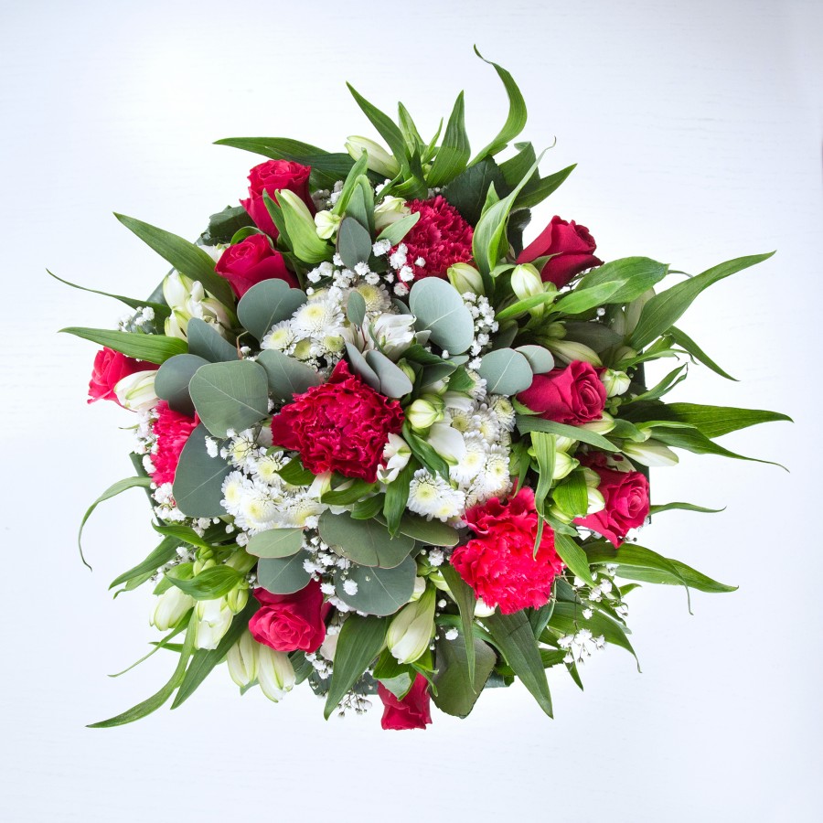 Indulge in the exquisite beauty of our Luxury Mixed Flower Bouquet. This unique arrangement features red roses and gypsophila intertwined with white chrysanthemums and vibrant carnations, all set against a backdrop of white alstroemeria and aspidistra leaves.